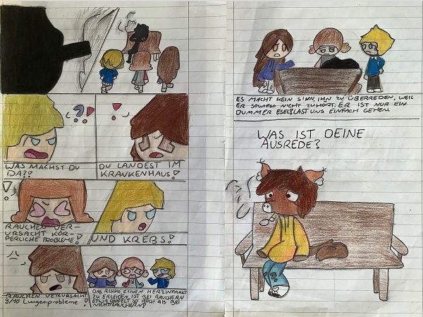 Die Klasse 6a der Realschule am Schlehenweg in Bielefeld hat ein Comic erstellt. "Wir haben uns damit beschäftigt, warum Menschen rauchen und warum sie es nicht tun sollten. Aus unserer Klasse raucht zum Glück noch niemand und wir haben es uns alle auch fest vorgenommen, nicht damit anzufangen. Denn es gibt so viele Gründe, die dagegensprechen, überhaupt erst mit dem Rauchen anzufangen. Wir alle haben das Glück, Zugang zu diesen Informationen zu haben und wir haben die Fähigkeit, uns bewusst dagegen zu entscheiden. Da haben wir Glück! Und keine Ausrede dafür, doch irgendwann zu rauchen."